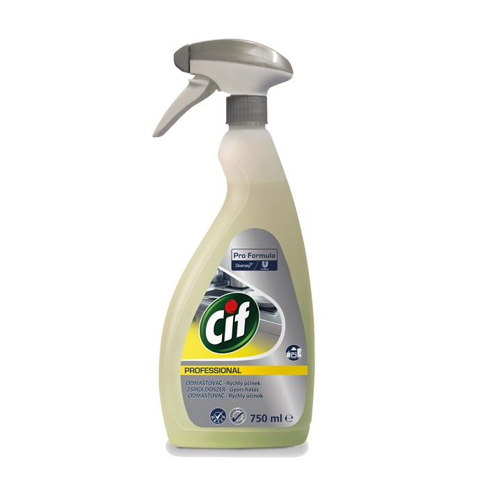 Cif Pro Formula Degreaser je prostriedok na odmastenie na okamžité použitie na povrchy, ktoré prichádzajú do styku s potravinami. Rýchlo rozpúšťa mastnotu a odolné nečistoty. Je neparfumovaný a je možné ho bez nebezpečenstva poškodenia aplikovať aj na hliník. Je vhodný na väčšinu povrchov v kuchyni ako sú napr. kuchynské náčinie, riad, hrnce, panvice, sporáky, odsávače pár, filtre, podlahy, steny, dvere a odpady.