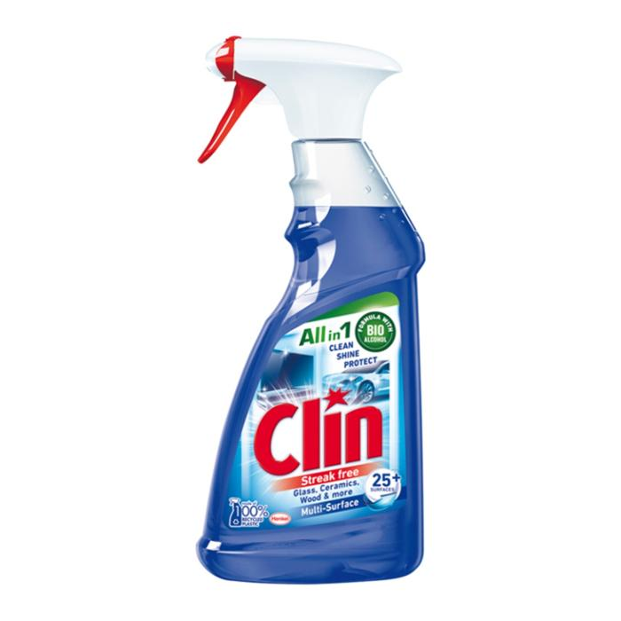 Clin Multi-Surface univerzálny čistič v spreji pre žiarivo čisté povrchy! Čistiace prostriedky Clin zaisťujú profesionálne čistenie okien a zrkadiel bez šmúh bez ďalšieho leštenia! Nová receptúra Clin s prírodnou zložkou bioalkohol odstraňuje nečistoty a špinu, a tak dokonale čistí sklenené, drevené, keramické a kamenné povrchy, a zaisťuje dlhotrvajúci lesk viac ako 25 druhov povrchov bez šmúh. Účinná receptúra All in 1 zaisťuje dokonalú čistotu, lesk bez šmúh a ochranu proti vode a nečistotám, takže povrchy zostávajú dlhšie čisté. Viacúčelový čistič okien má špeciálne odhmlievacie zloženie, ktoré zabraňuje vzniku pary, rosy a hmly, takže sa vlhkosť na oknách a zrkadlách neusadzuje a sklenené povrchy zostávajú krištáľovo čisté. Jedinečná konštrukcia rozprašovača Clin rovnomerne rozptyľuje prípravok pomocou funkcie rozprašovania a maximalizuje distribúciu prípravku pomocou funkcie peny pre účinné odstránenie odolnej špiny a nečistôt.