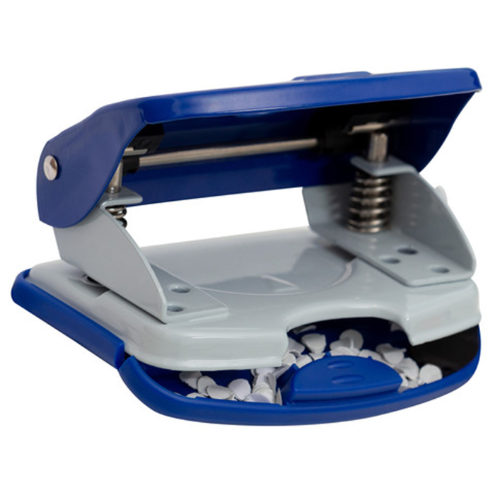 Pevná dierovačka s posuvným pravítkom. Prevedenie plast, mechanika kovová, ergonomický dizajn. Rozpätie dier 8 cm. Kapacita dierovania 20 listov. Farba modrá/sivá
