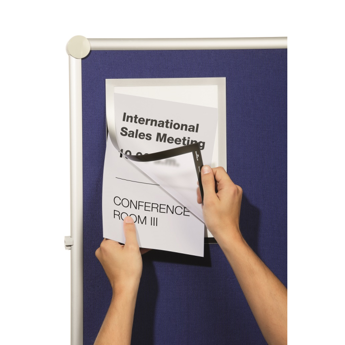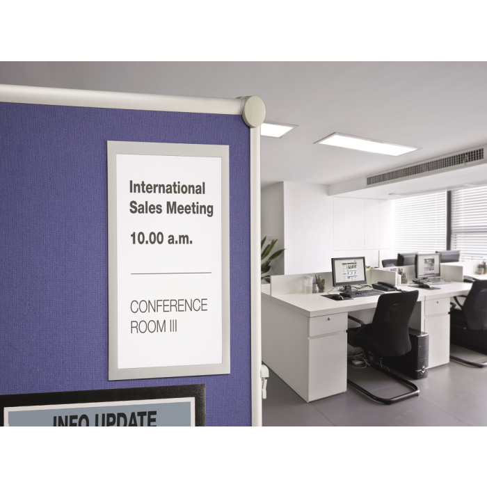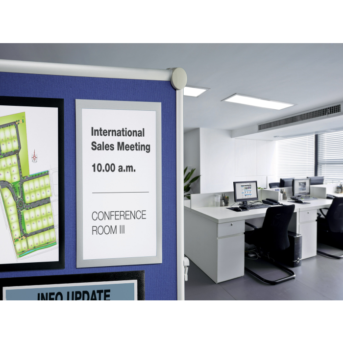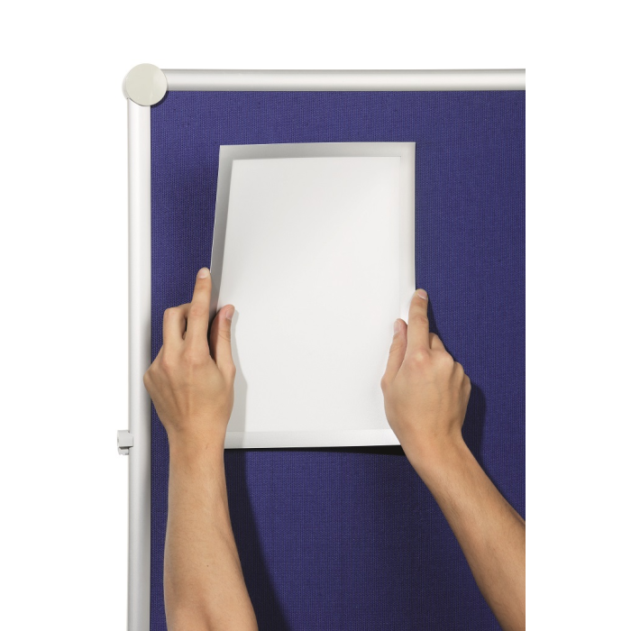 Informačný panel použiteľný iba na textilné povrchy, ako napr. textilné a moderačné tabule. Jednoduché a rýchle vkladanie informácie formátu A4. Na zadnej strane špeciálny priľnavý povrch, ktorý pri premiestňovaní panelu nepoškodzuje textilný povrch tabule. Farba strieborná. Balenie 1 ks.