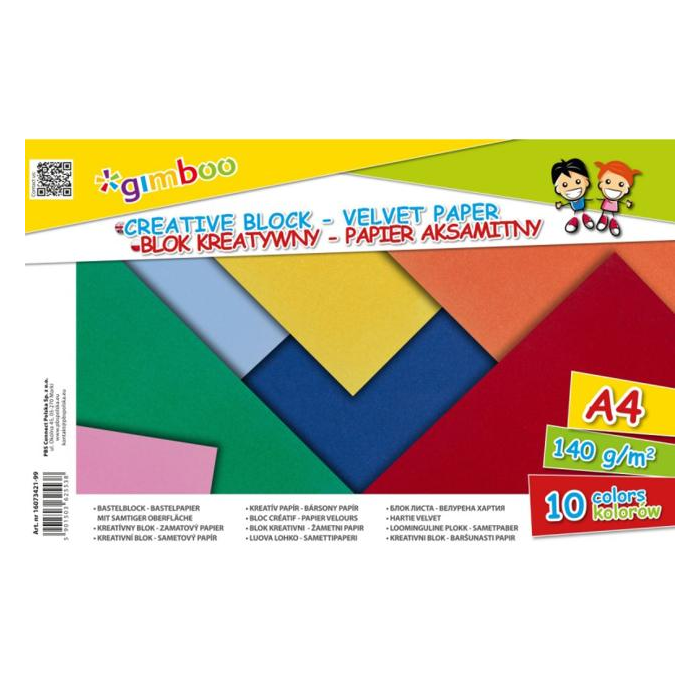 Kreatívny farebný blok GIMBOO A4, zamatový papier, lepený, 10 farieb, 140 GSM