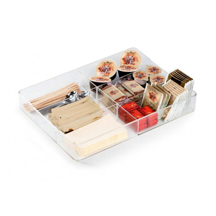 Vložka do zásuvky modulu k občerstveniu COFFEE POINT BOX. Ideálna na uskladnenie príborov, lyžíc, miešadiel a iných doplnkov k občerstveniu. Vhodné aj na potraviny. Materiál vysokokvalitný akryl, možnosť umývania v umývačke. Rozmery (š × h × v) 242 × 329 × 48 mm. Farba priehľadná číra.