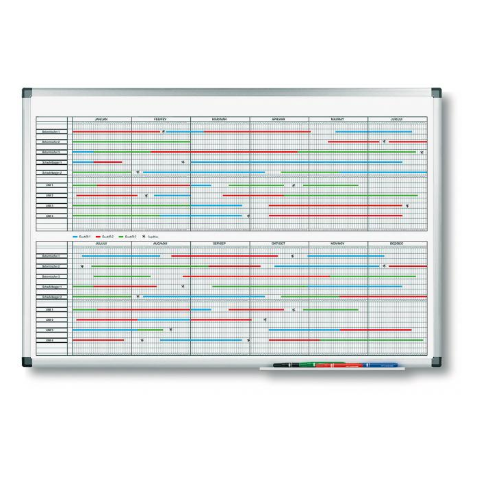 Tabuľa s popisovateľným magnetickým a špeciálne lakovaným a UV tvrdeným povrchom vo verzii ročného plánovača Premium v dvoch polovinách, vhodného pre dlhodobé projekty. Pre prehľadné plánovanie do 20 ľudí/ objektov. Magnetický povrch. Sada príslušenstva zahrňuje 4 stierateľné popisovače TZ 111 a 40 magnetických menoviek veľkosti 10 × 60 mm s bielymi štítkami.