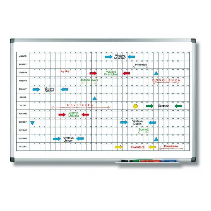 Tabuľa s popisovateľným magnetickým a špeciálne lakovaným a UV tvrdeným povrchom vo verzii ročného plánovača s názvami mesiacov dole po strane (`kalendárový` štýl). Ideálna ako `personálny plánovač`. Magnetický povrch. Sada príslušenstva zahrňuje 4 stierateľné popisovače TZ 111 a 20 mm magnetické symboly.