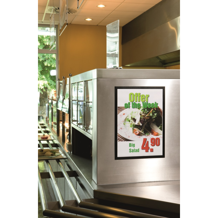 Samolepiaci informačný panel s prednou magnetickou časťou. Ideálny na vystavovanie plagátov, kľúčových informácií, špeciálnych oznamov alebo dôležitých čísel. Informácie sa ľahko vymieňajú a sú čitateľné z oboch strán, ak sa panel umiestni napr. na okno alebo priehľadné dvere. Vhodný na hladké a pevné povrchy. V prípade potreby je ľahko premiestniteľný bez potreby vŕtania. Formát A3, rámik čierny.