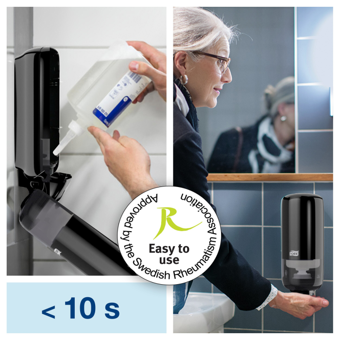 Dávkovač penového mydla TORK Elevation s jednoduchým dávkovaním, ideálny pre deti a staršie osoby. Jednorazové náplne zaručujú vysokokvalitné mydlo. Výmena náplne v priebehu niekoľkých sekúnd. Materiál ABS plast. Rozmery dávkovača 113 × 286 × 105 mm. Farba čierna.