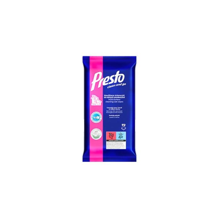 PRESTO ANTISTATIK VLHČENÉ UTIERKY 72 ks. Presto Clean vlhčené utierky antistatické sú navrhnuté na efektívne čistenie prachu a nečistôt z rôznych povrchov v domácnosti s antistatickým účinkom, ktorý zabraňuje opätovnému usádzaniu prachu. Tieto utierky sú ideálne na čistenie elektroniky, sklenených plôch, plastov a ďalších povrchov náchylných na prach, pretože pomáhajú predĺžiť čistotu a sviežosť týchto plôch. Vďaka svojmu zloženiu Presto Clean antistatické utierky účinne zachytávajú prach, špinu a iné nečistoty bez toho, aby po sebe zanechávali šmuhy či lepkavé stopy. Zároveň vďaka antistatickému účinku pomáhajú minimalizovať statickú elektrinu, čo znamená, že prach sa na čistené povrchy nebude tak rýchlo vracať. Používanie utierok je veľmi jednoduché a pohodlné, pričom zanechávajú príjemnú sviežu vôňu. Hlavné vlastnosti: Účinne odstraňujú prach a nečistoty Antistatický účinok zabraňuje opätovnému usádzaniu prachu Vhodné na elektroniku, sklenené, plastové a iné prachom náchylné povrchy